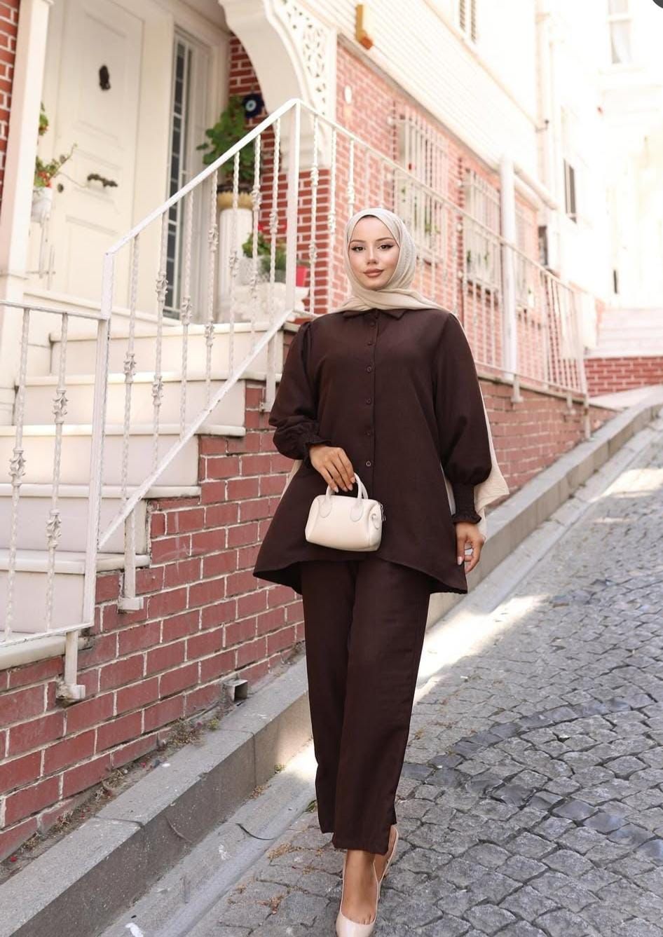 Schlicht, edel und zeitlos – das zweiteilige Set ALYA vereint Minimalismus mit maximalem Komfort. Das lockere Oberteil mit Hemdkragen und durchgehender Knopfleiste sorgt für eine elegante Silhouette, während die weit geschnittene Hose Bewegungsfreiheit und Leichtigkeit bietet. Durch den cleanen Schnitt und das dezente Design eignet sich ALYA perfekt für Alltag, Büro oder besondere Anlässe. Mit den richtigen Accessoires kannst du den Look sowohl casual als auch chic stylen.