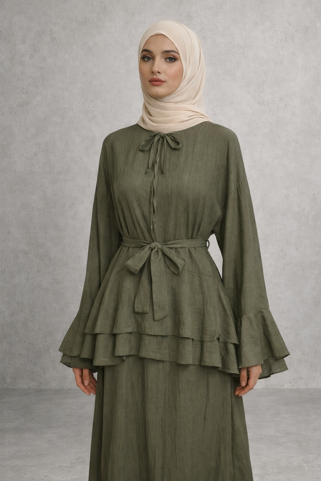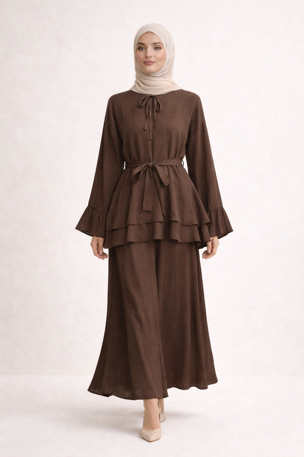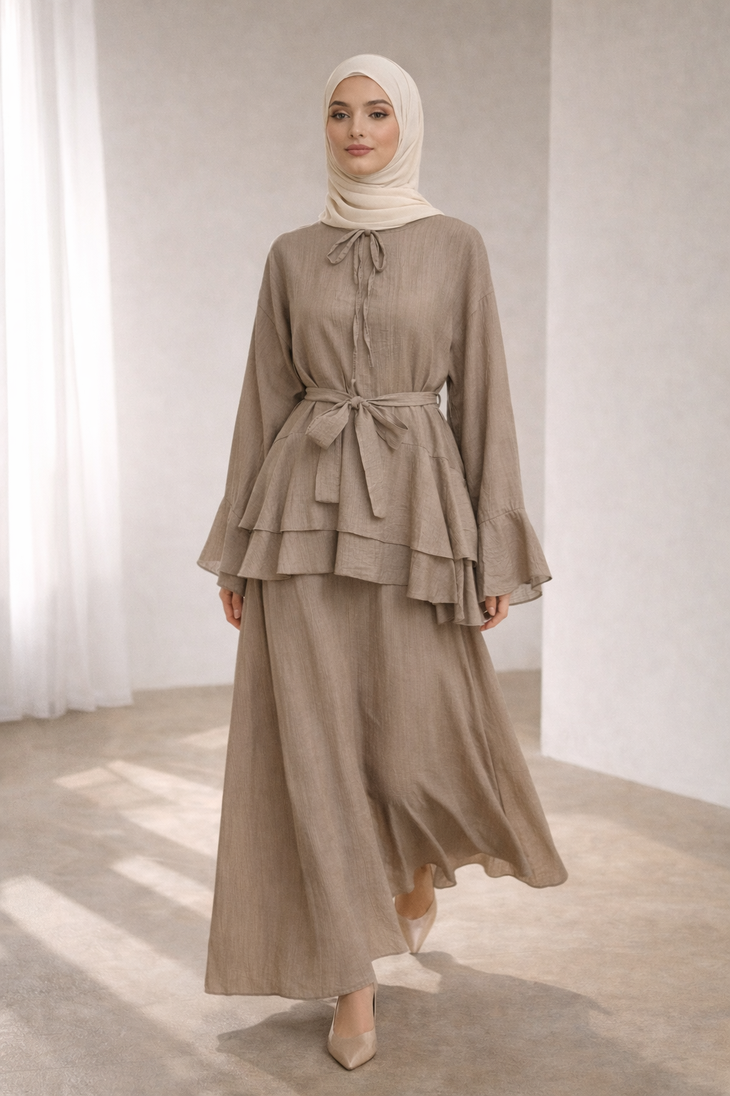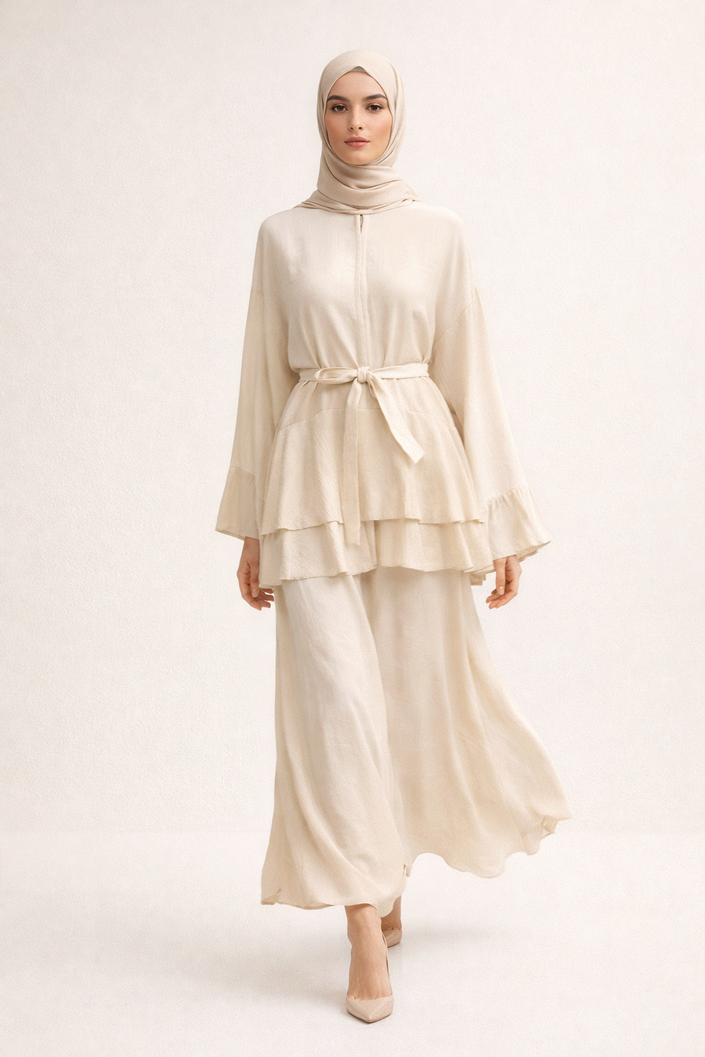 Die feminine Bluse mit Volant-Details und Bindegürtel sorgt für eine elegante Silhouette, während der fließende Maxi-Rock einen modernen, luftigen Touch verleiht.