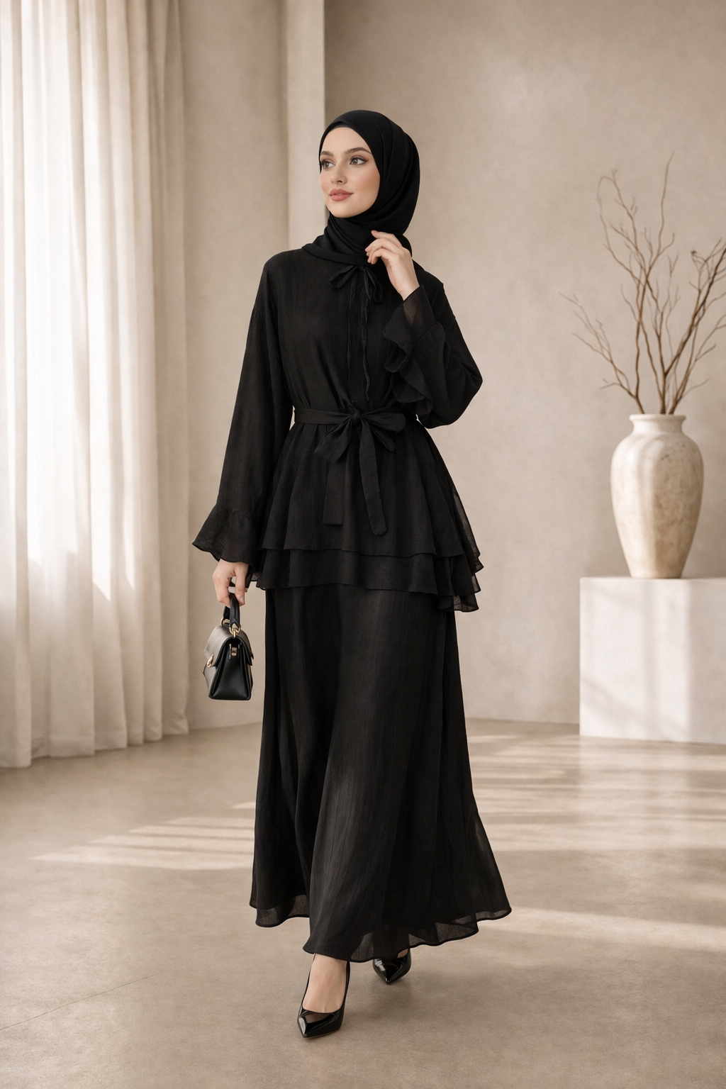Kombiniere das Set mit eleganten Schuhen und einer schlichten Tasche für einen modernen, hochwertigen Look